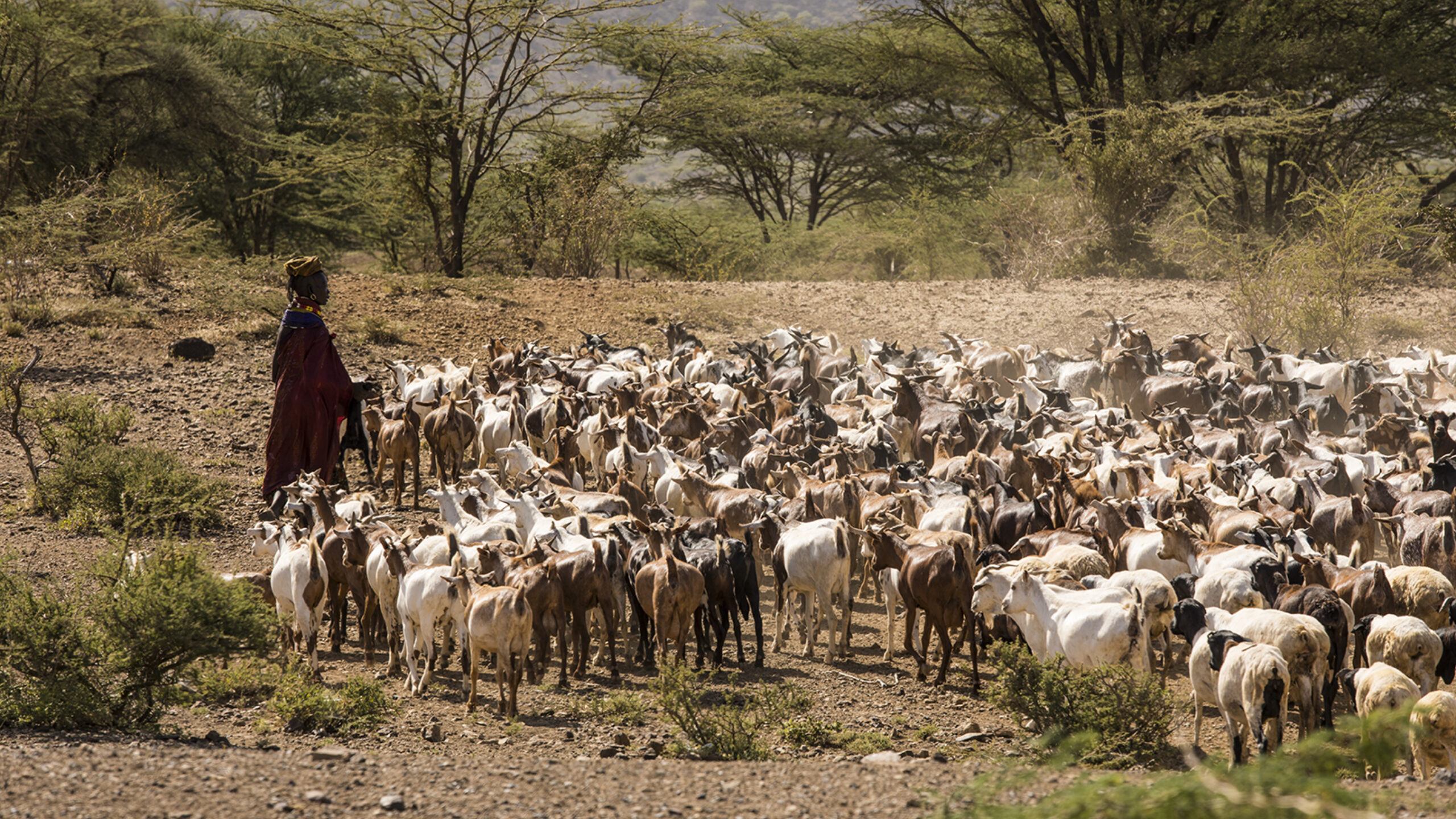 De larges étendues de terre séparent de petites communautés, qui consistent en une série de huttes construites avec des matériaux trouvés sur place, comme de la terre et des branches séchées. Des personnes, vêtues de tissus colorés, sont assises sous les arbres. D’autres, un long bâton à la main, marchent à côté de troupeaux de chèvres, de chameaux ou de vaches.